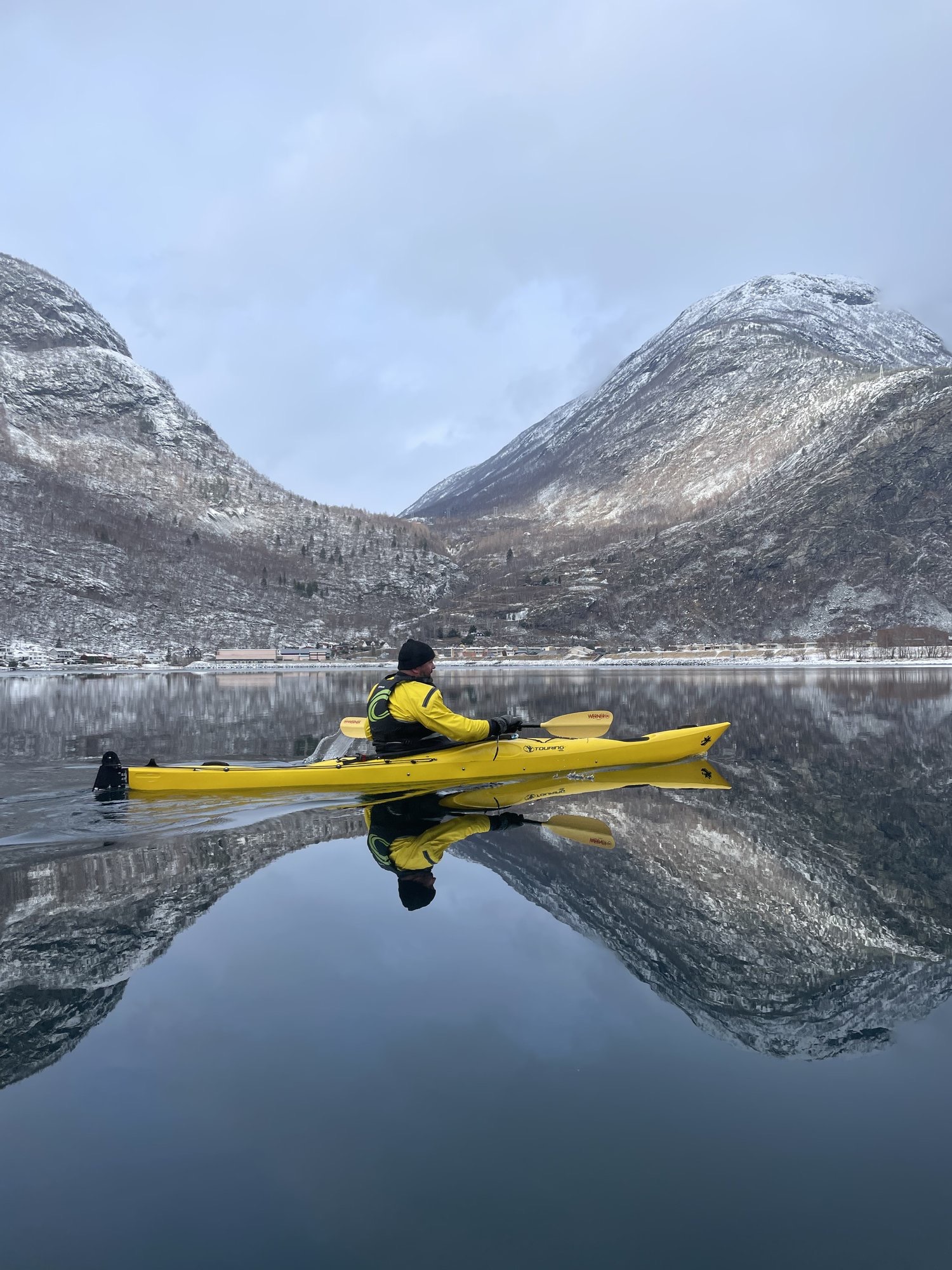 Kajaksejlads om vinteren er eksotisk for de fleste mennesker, omgivet af snedækkede bjerge i kontrast til den mørke Sognefjord.