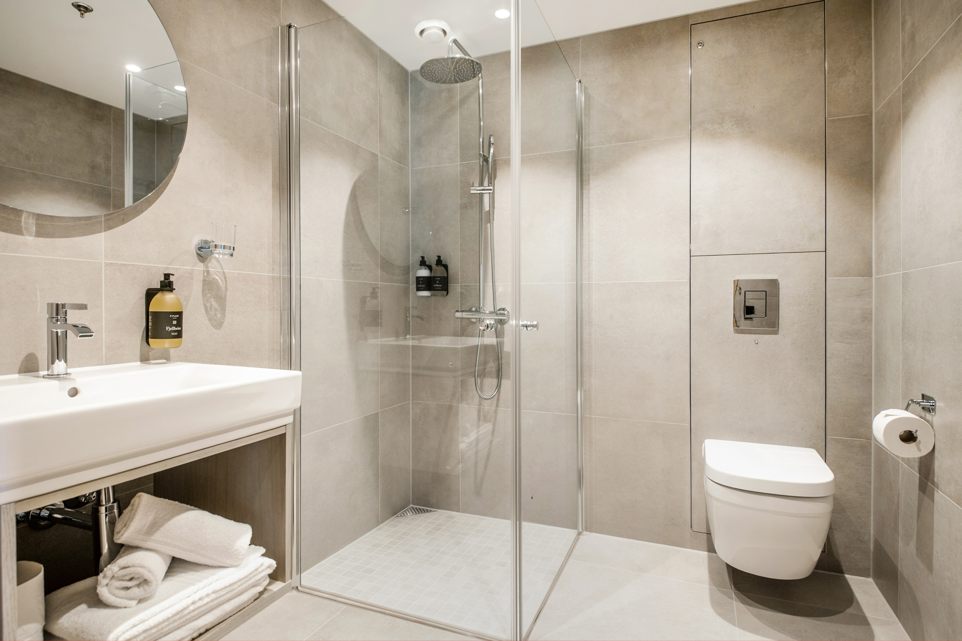 Here you can wake up in comfortable Wonderland beds and enjoy your morning coffee on the window sofa. The room has large windows with views and lots of natural light. Some of the windows can be opened for ventilation, and the windows have individually adjustable sunshades. The bathroom has a modern style and is equipped with a rain shower.