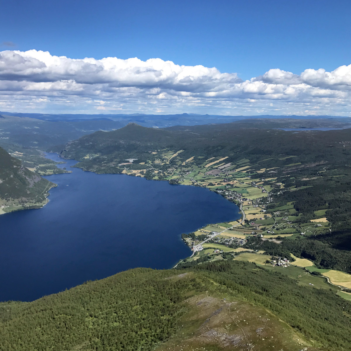 Wanneer je eindelijk "Ukseporten" passeert, de laatste bocht voordat je het bergplateau op de top bereikt, raden we je ten zeerste aan om door te lopen naar de steenhoop op de top (zie kaart hieronder). Vanaf hier heb je een fantastisch uitzicht over Vang en Vangsmjøse, die duizend meter lager liggen.
